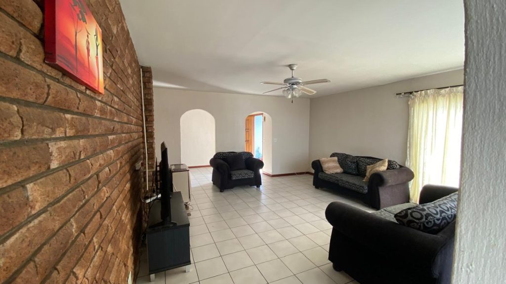 The home boasts a comfortable living room and dining area with separate kitchen. The entire property is fully fenced and includes a swimming pool and an outdoor braai area, perfect for entertaining.