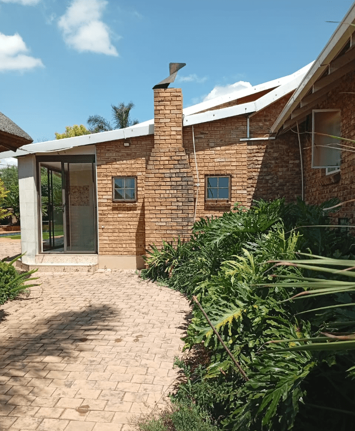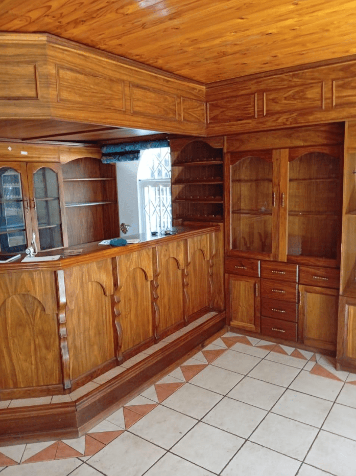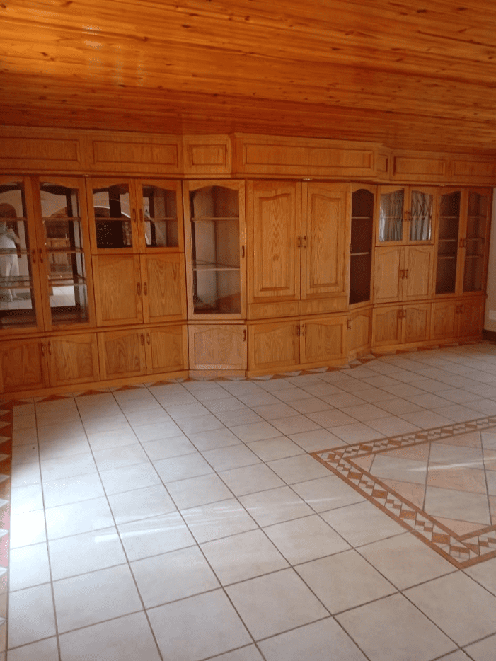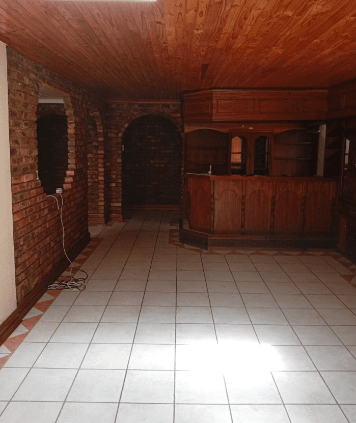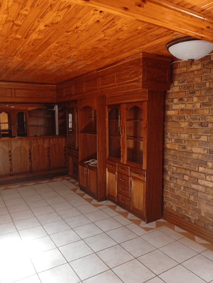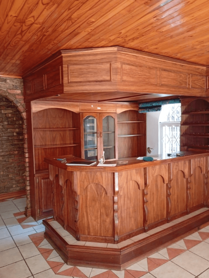 It features a modern kitchen and scullery, a full Imbuya bar room with canopy and wine wall unit, an adjacent chill room, a big lounge with oak TV wall units, laundry room with abundant built-in cupboards, braai room with built-in braai and basin, pool changing room, big double study with sliding doors to the outside, and servant’s quarters with shower, toilet and basin.
