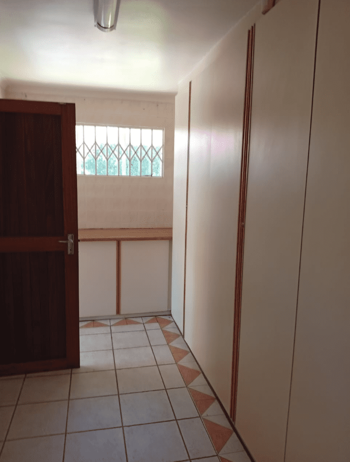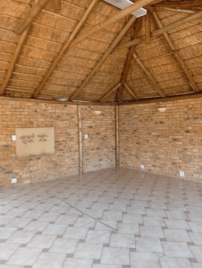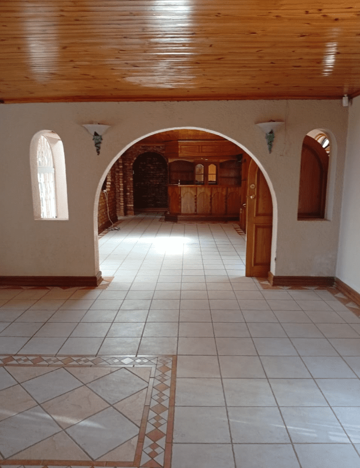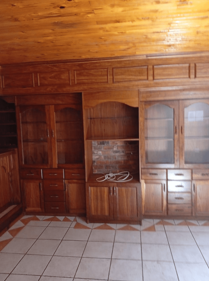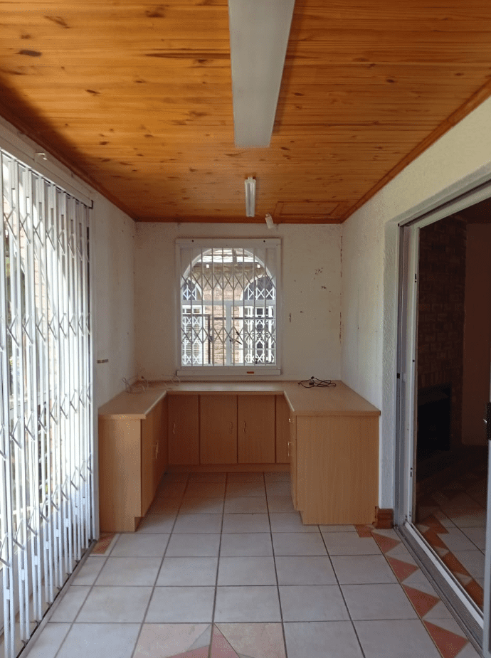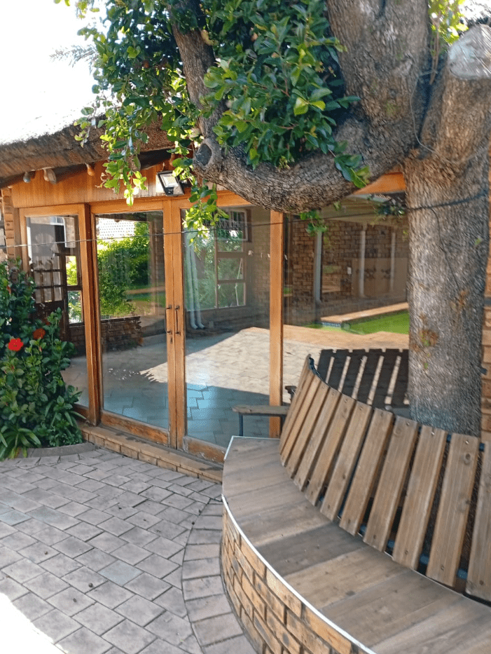 It features a modern kitchen and scullery, a full Imbuya bar room with canopy and wine wall unit, an adjacent chill room, a big lounge with oak TV wall units, laundry room with abundant built-in cupboards, braai room with built-in braai and basin, pool changing room, big double study with sliding doors to the outside, and servant’s quarters with shower, toilet and basin.