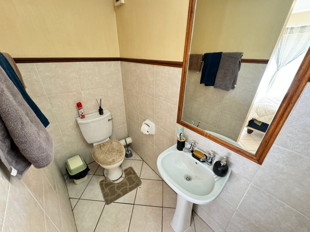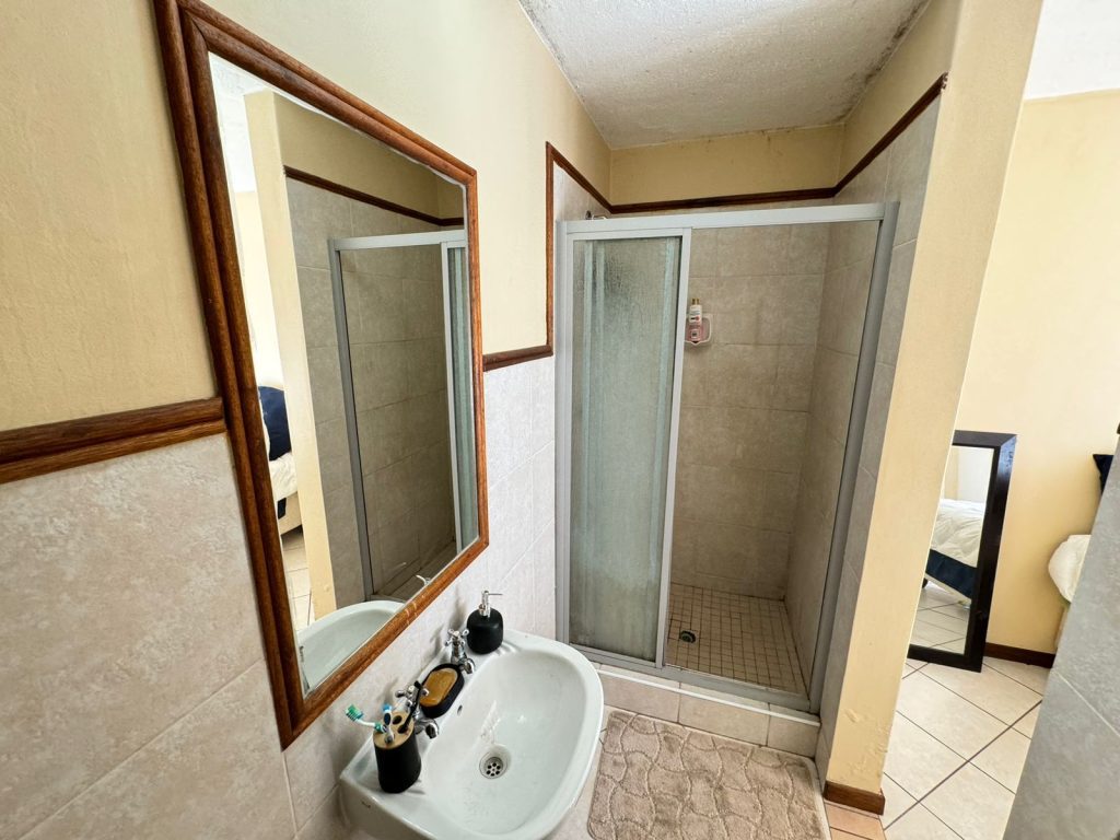 The bedroom is generously sized with ample cupboard space and includes an en-suite bathroom fitted with a shower, basin, and toilet.