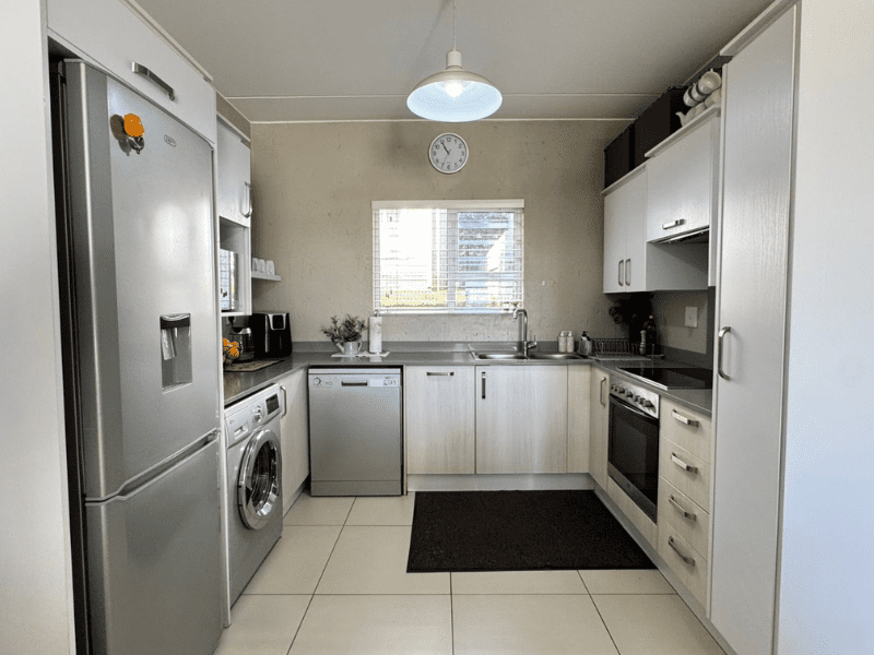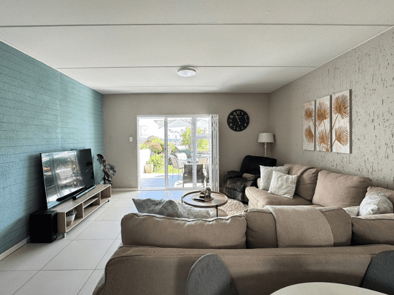 The kitchen seamlessly flows into the dining and lounge area, bathed in natural light from sliding doors that lead to a covered patio and your own private garden—ideal for gatherings or quiet moments.